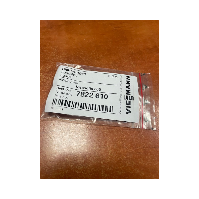 Dans cette fiche produit Viessmannexpress vous trouverez le détail de la pièce détachée pour chaudière Viessmann 7822610 - Fusibles T 6,3A (5 pièces) faisant partie de la famille Accueil et correspondant à la référence du fabricant Viessmann n° 7822610